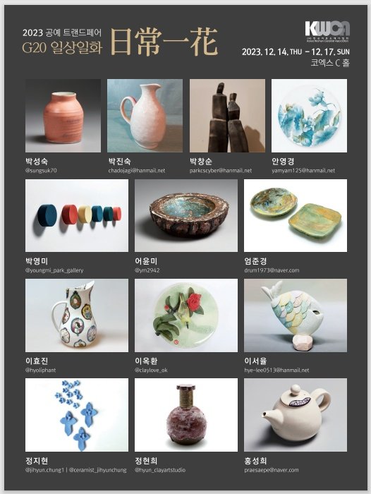 2025 신입회원전 <2025 신입회원전> 일정: 2025.04.22-28 장소: 문화공간 길담 (서울시 종로구 지하문로 17길 12-9) 주최: (사)한국여류도예가협회 주관: (사)한국여류도예가협회 임원일동 이 글 공유하기:트위터FacebookPinterest인쇄 2025-10-01T13:53:23+09:002025-04-22|Categories: 신입회원전, 협회활동|Tags: 2025, 전시| 관련글보기 2025 정기총회 Gallery 2025 정기총회 2024 신입회원전 Gallery 2024 신입회원전 2024 국제전시 Gallery 2024 국제전시 2024 정기전시 Gallery 2024 정기전시 2023 공예 트렌드페어 Gallery 2023 공예 트렌드페어 댓글 남기기 응답 취소